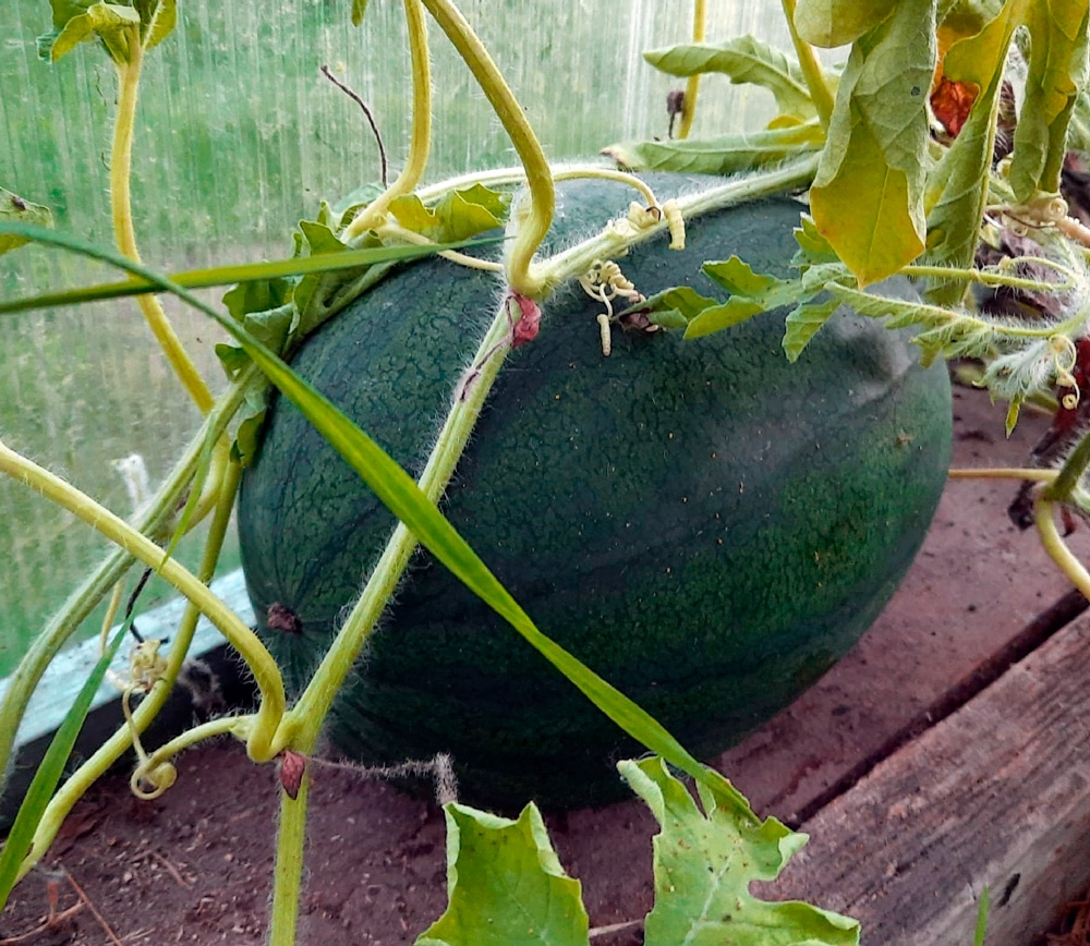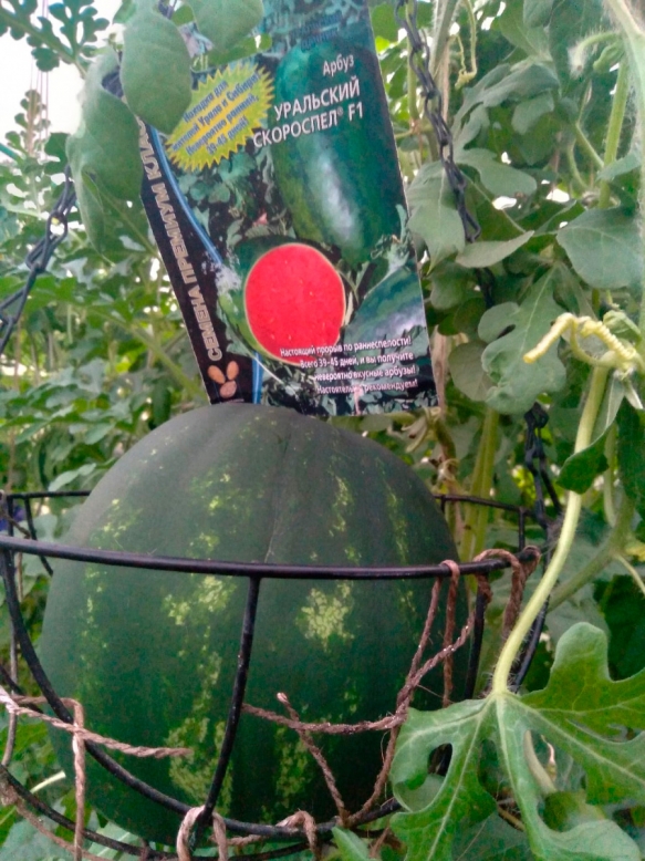 Гибрид невероятно раннего срока созревания, от всходов до первых плодов всего 39-45 дней. Образует крайне интересные мини-плоды: от овальной до слегка удлинённой формы. Средняя масса около 1-1,2 кг, но некоторые ягоды достигают 2-х и более кг. Окраска слегка полосатая, у некоторых плодов более темная. Кора очень тонкая. Мякоть рубиново-красная, очень сочная, необычайно приятно хрустящая, искрящаяся сахарными зёрнами и очень сладкая. Мини плоды чрезвычайно удобны в транспортировке, и всегда свежую, освежающую ягоду можно скушать за один раз целиком!