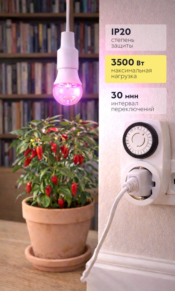 Розетка с таймером даёт возможность автоматически включать и выключать подсветку для растений, а также бытовые электроприборы когда вас нет дома. Работу устройства настраивают с помощью механического диска, шаг - 30 минут.Нужно включить подсветку с 8 до 10 утра и с 16 до 19...