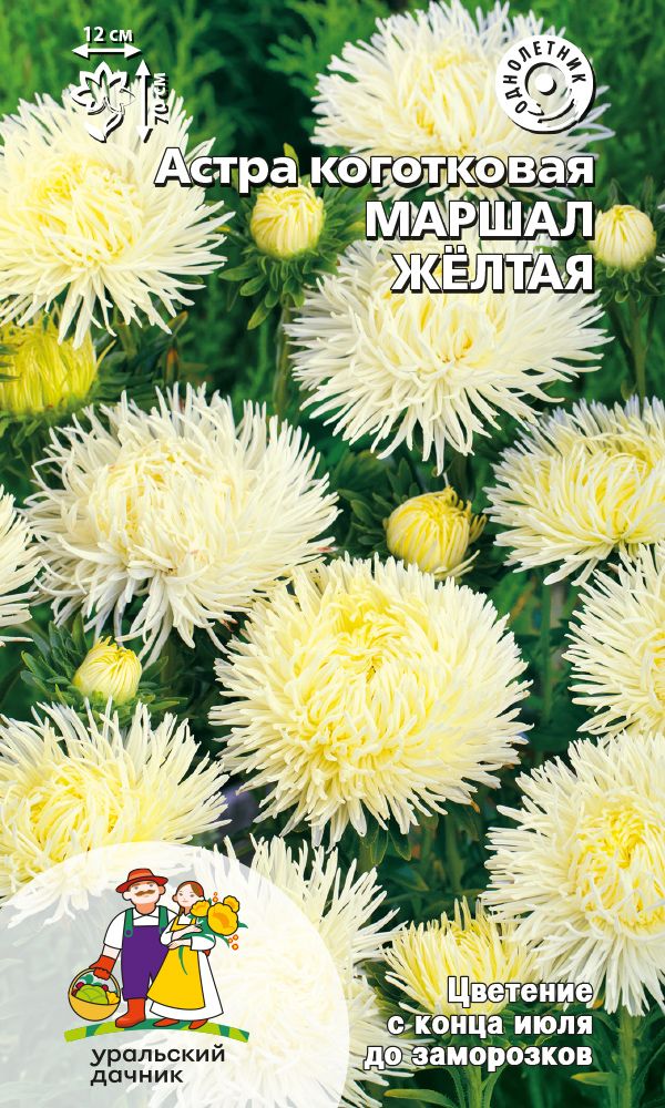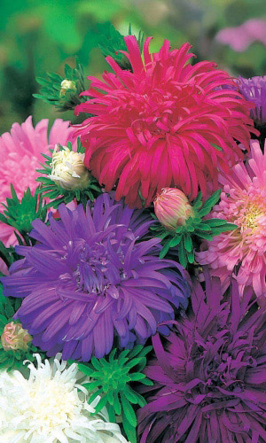 Густомахровая игольчатая астра! Растения высотой около 60 см. Соцветия густые длинноиголчатые, белые, кремово-жёлтые, серебристо - голубые, фиолетовые, серебристо - розовые, красные. Цветет в августе - сентябре. Используют очень широко: для посадки в сборные цветники...