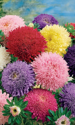 Великолепная смесь окрасок высокорослых, обильноцветущих астр, с крупными, густомахровыми соцветиями. Кусты широкораскидистые, прочные, высотой 60-70 см. Соцветия-корзинки полусферические, почти шаровидные, похожи на пионовидные, разнообразных окрасок. Декоративная...