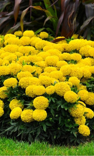 Роскошные, мощные кусты с многочисленными, густомахровыми соцветиями нежного, золотисто-жёлтого цвета, хризантемовидной формы. Бархатцы гармонично выглядят в любых цветниках, прекрасно держат форму (не разваливаются от дождя и ветра), переносят понижение температуры...