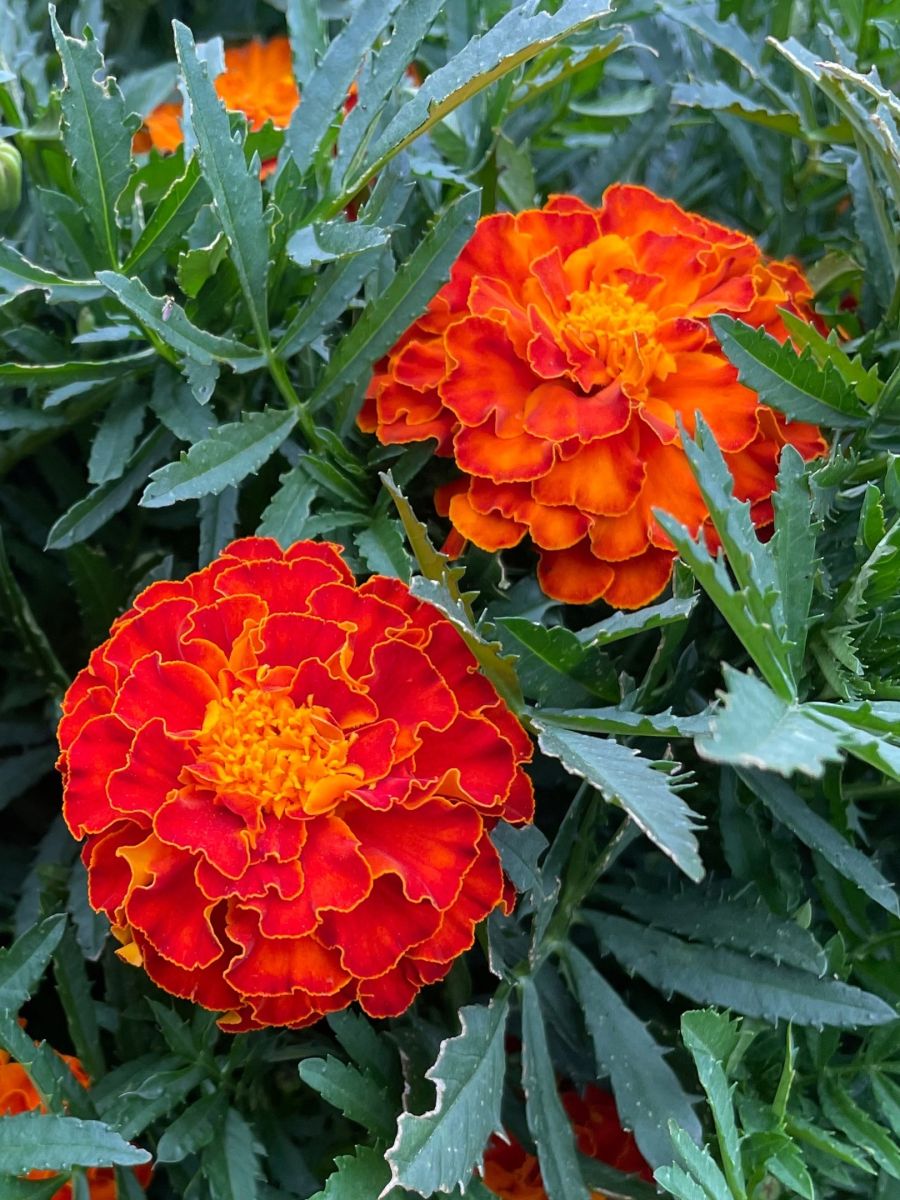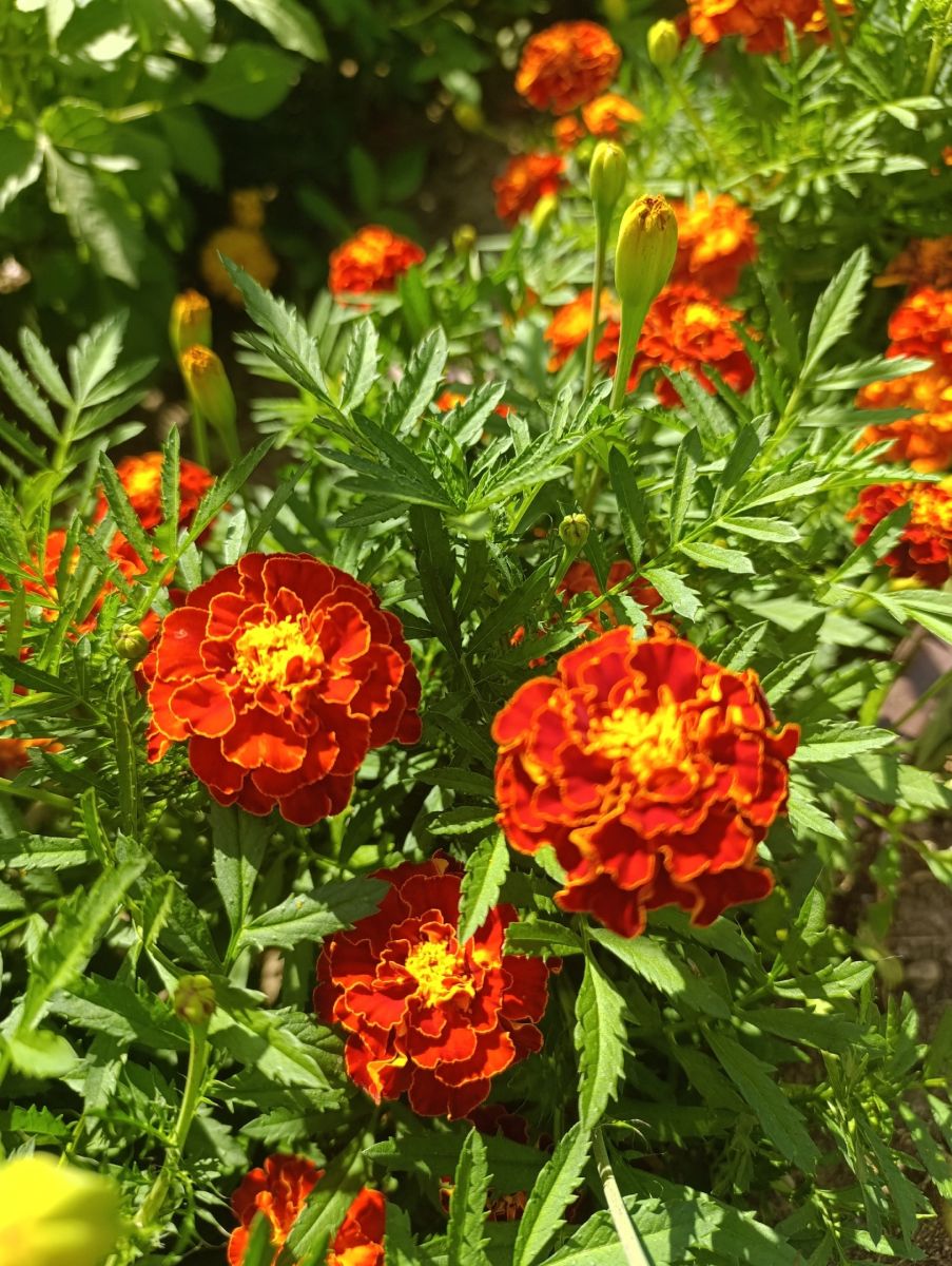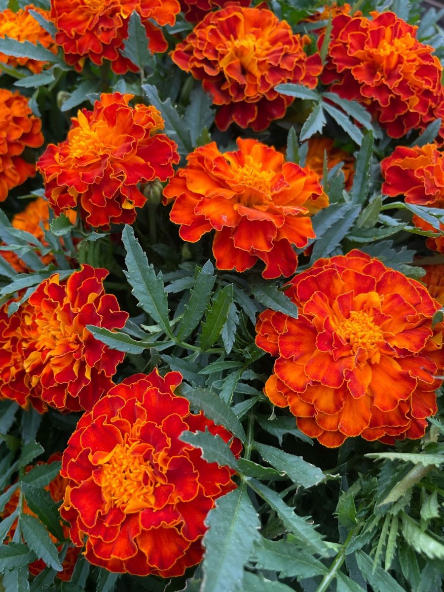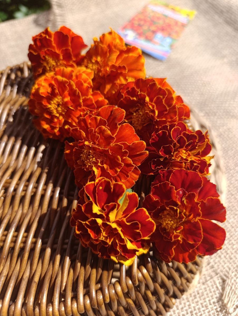 Бархатные соцветия изумительной красоты. Куст компактный, густо-облиственный, в период цветения весь покрывается яркими, двуцветными, оранжево-красными, с золотистыми краями цветками, собранными в махровые соцветия. Используют для клумб, рабаток, бордюров и украшения...