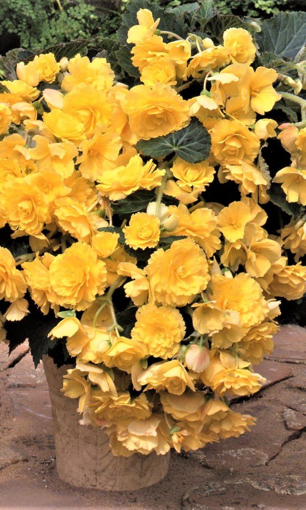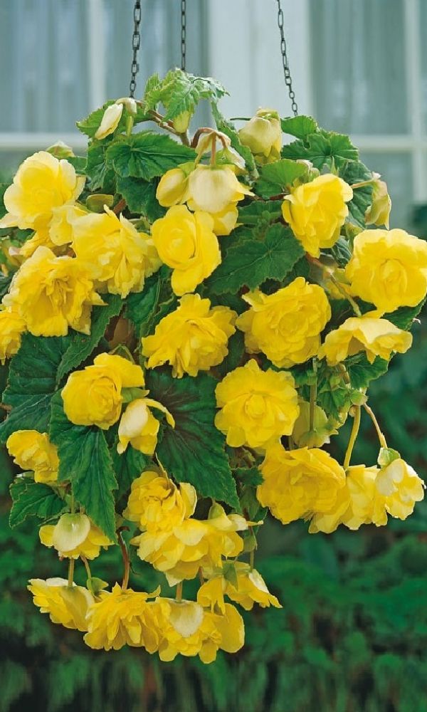 Ампельная бегония. Растение формирует 5-8 побегов длиной 35-40 см, усыпанных жёлтыми цветками. Цветки махровые и полумахровые, камелиевидной формы, 6-8 см в диаметре. Цветение обильное и продолжительное. Ампельная бегония великолепно смотрится в подвесных кашпо и балконных ящиках...