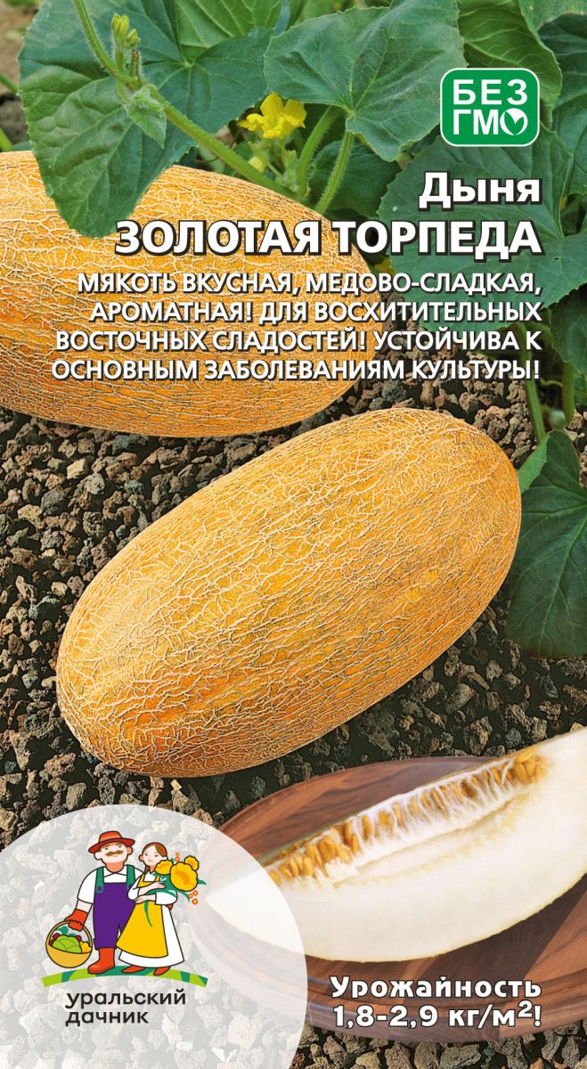 Красивая крупная дыня с отличным вкусом и ароматом! Для выращивания в теплицах и отрытом грунте. Сорт среднеранний – формирует урожай через 70–80 дней от всходов. Растение плетистое, на каждом формируется 3-4 плода. Плоды овальные, массой 2,5-5,0 кг. Мякоть средней плотности, с оптимальным содержанием сухого вещества и сахаров. Сорт подходит для употребления в свежем виде и переработки. Толерантен к болезням. Сохраняет товарность плодов в течение 2 недель.