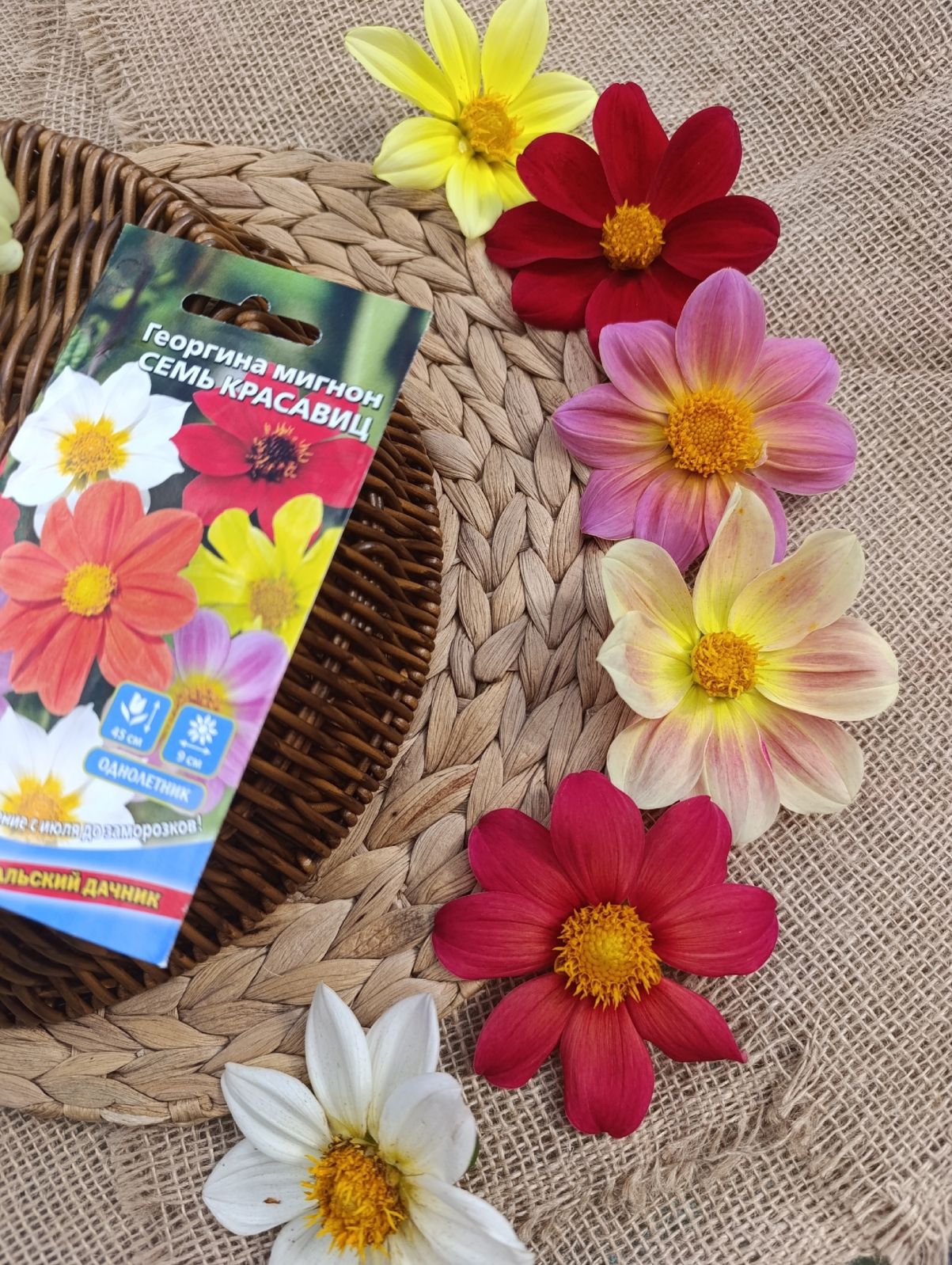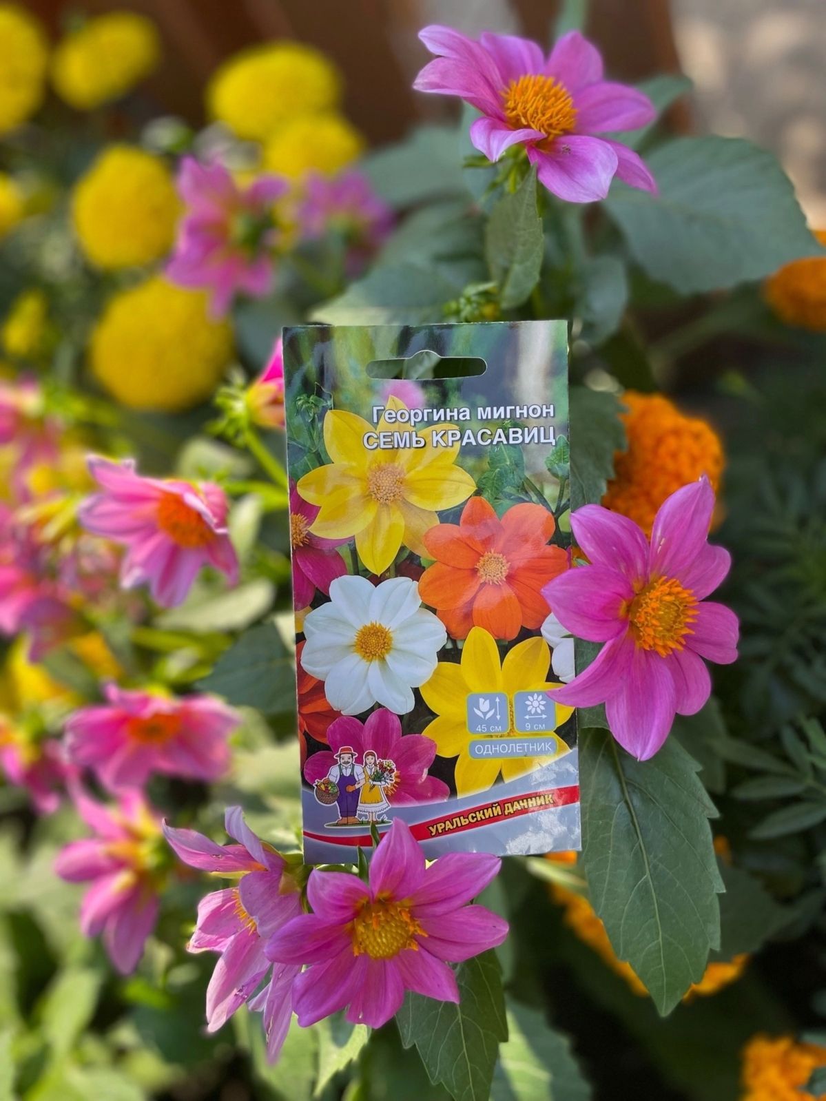 ОднолетнееЖизнерадостные низкорослые георгины! Растения компактные, высотой около 45 см. Соцветия разнообразных окрасок, диаметром 8-9 см. Используют в цветниках большими группами на клумбах. Прекрасный материал для срезки.