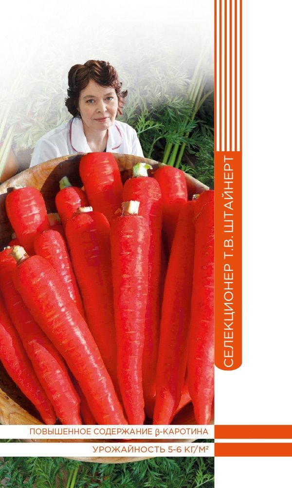 Высокоурожайный, позднеспелый сорт для хранения. Корнеплоды красно-оранжевые, удлинённо-конусовидной формы, со слегка заостренным кончиком, длиной 25–27 см. Мякоть нежная, сочная, сладкая, хрустящая, сердцевина очень маленькая. Ценность сорта: отличные вкусовые качества, повышенное содержание каротина, длительное хранение, устойчивость к цветушности...
