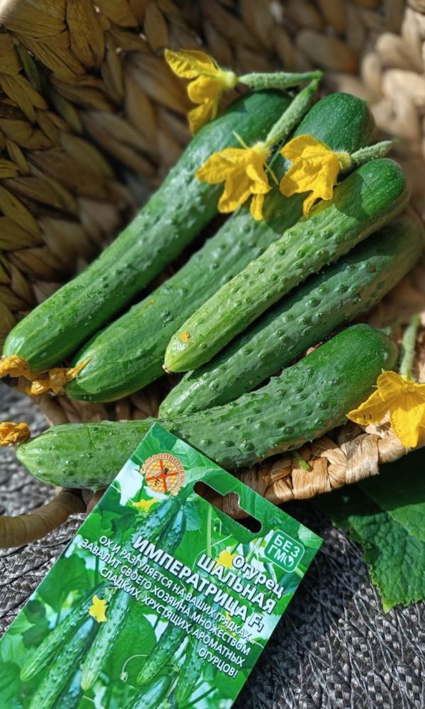 Партенокарпический гибрид с хорошими плодами по форме и окраске. Раннеспелый, высокоурожайный, для открытого грунта. Растение сильнорослое. Плод цилиндрический, тёмно-зелёной окраски, со слабыми светлыми полосками, мелкобугорчатый, сочный, хрустящий, без горечи, длиной до 10 см. Отличные вкусовые качества. Высокая устойчивость к комплексу болезней огурца. Универсальное использование. ...