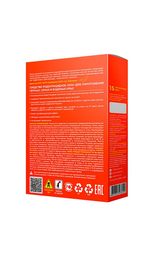 Применение: разместите препарат в специальных контейнерах, лотках, ящиках или на подложках из плотной бумаги и полиэтилена внутри помещений. Для использования на улице также можно использовать контейнеры, лотки, ящики и кусочки труб. Обязательно защитите приманку от птиц. Размещение средства в контейнерах повышает его привлекательность для грызунов и предотвращает растаскивание.