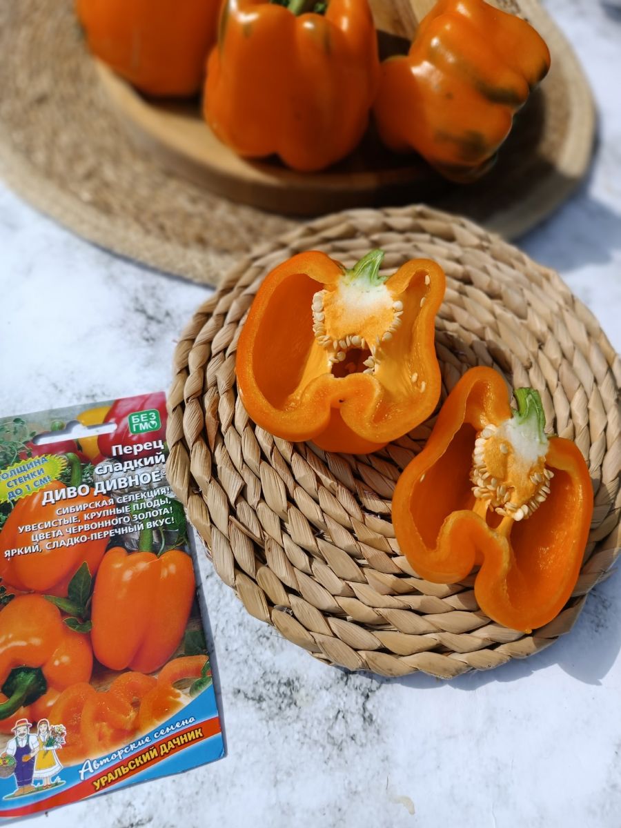 Уникальный раннеспелый сорт, который по общему урожаю превосходит стандарт до 30 %. Куст штамбовый, растение компактное, высотой 60-65 см, среднеоблиственное. Плоды очень крупные, увесистые массой до 200 г, призмовидной формы, в технической спелости тёмно-зелёные, в биологической – оранжевые, толщина стенки стремится к 1 см. Мякоть сочная, сладкая, с ярко выраженным перечно-фруктовым ароматом.