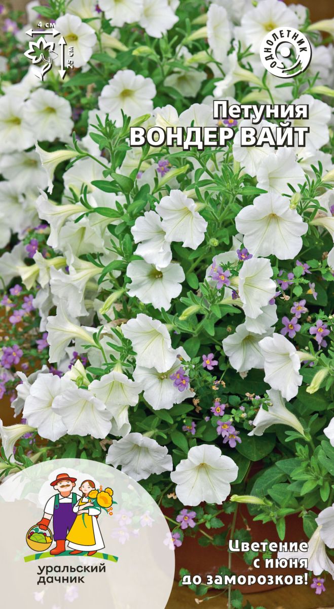 ОднолетнееМодное сочетание белых соцветий и нежно-зелёной листвы. Красивые крупные чисто-белые цветы украшают плотный кустик высотой около 25 см. Обильно цветёт с июля по сентябрь. Используют в клумбах для ярких групп, на бордюрах, рабатках, в подвесных корзинках.