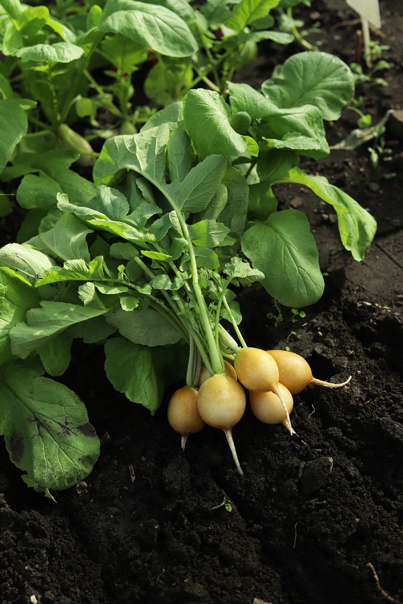 У корнеплода (кстати, растёт он полностью погруженным в почву), как уже отмечалось, необычный жёлтый цвет и исключительно правильная круглая форма, будто кто-то циркулем отчертил окружность. Ничего не напоминает? Да это же весёлый смайлик, заряжающий невероятным позитивом! Средний диаметр корнеплодов 6-6,5 см, вес – 28-30 г, они обладают очень хорошей товарностью. И, безусловно, этот самый первый огородный овощ необычайно вкусен: белоснежная мякоть – сладковатая, как шёлк нежная, сочная, обрамлённая золотой корочкой… Как же превосходен этот «смайлик» в свежей нарезке и салате! Это точно Золотое чудо!