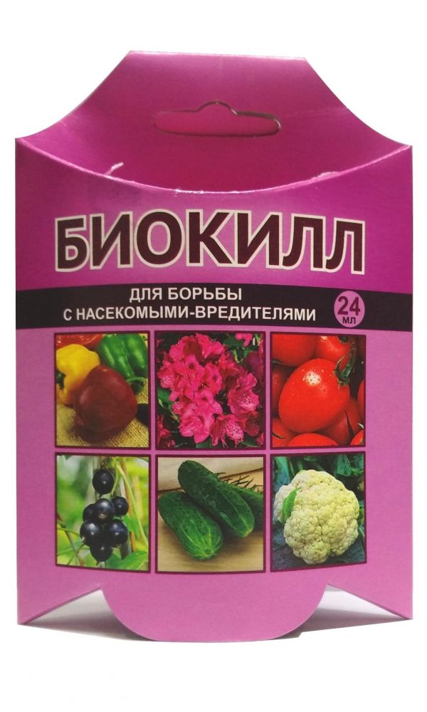Он эффективно уничтожает большинство распространённых вредителей (капустную белянку, капустную совку, паутинного клеща, яблонную плодожорку, трипсов, все виды тли). Хорошо работает даже в жару. При этом не загрязняет окружающую среду, быстро разрушается в воде и почве, не накапливается в плодах и овощах. А главное – после обработки «БиоКиллом» плоды, овощи, ягоды, зелень можно убирать и употреблять в пищу уже через 3 дня!