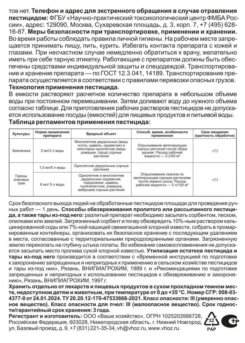 | Земляника | 3 мл / 3 л воды | Многолетние двудольные (виды осота, щавель, одуванчик) и некоторые однолетние (виды ромашки, горца) сорные растения | Опрыскивания вегетирующих сорных растений после сбора урожая. Расход рабочей жидкости - 3 л / 50 м2 | -(1) |