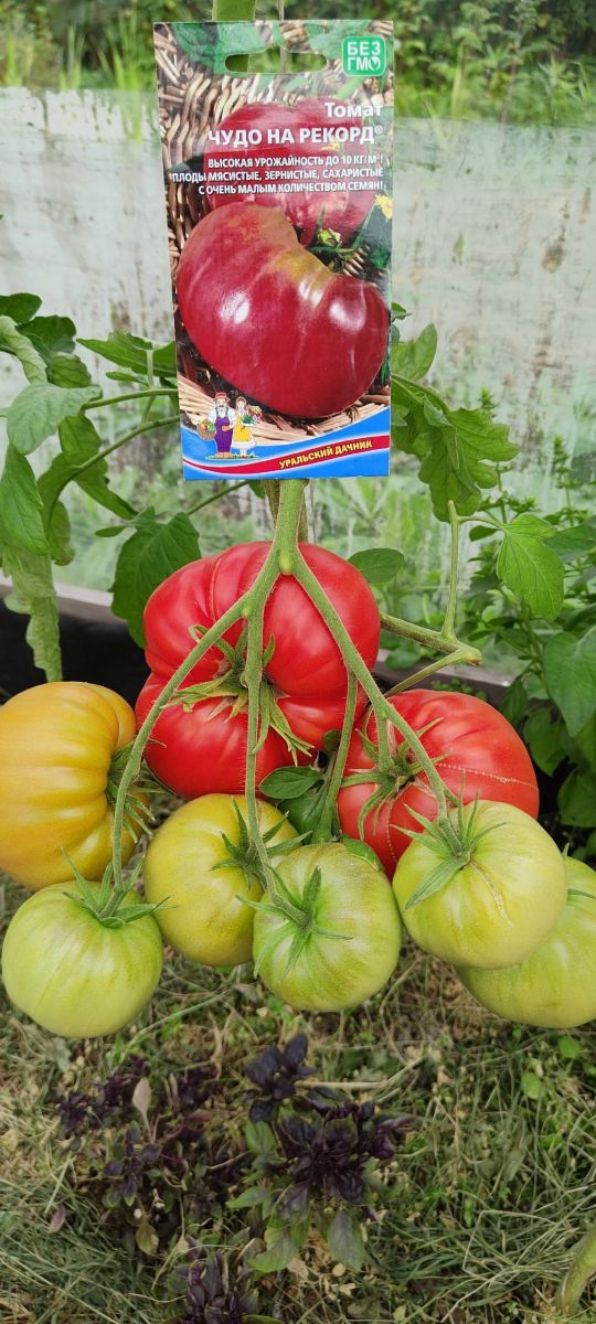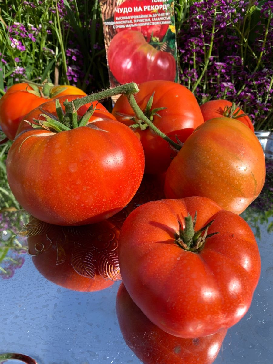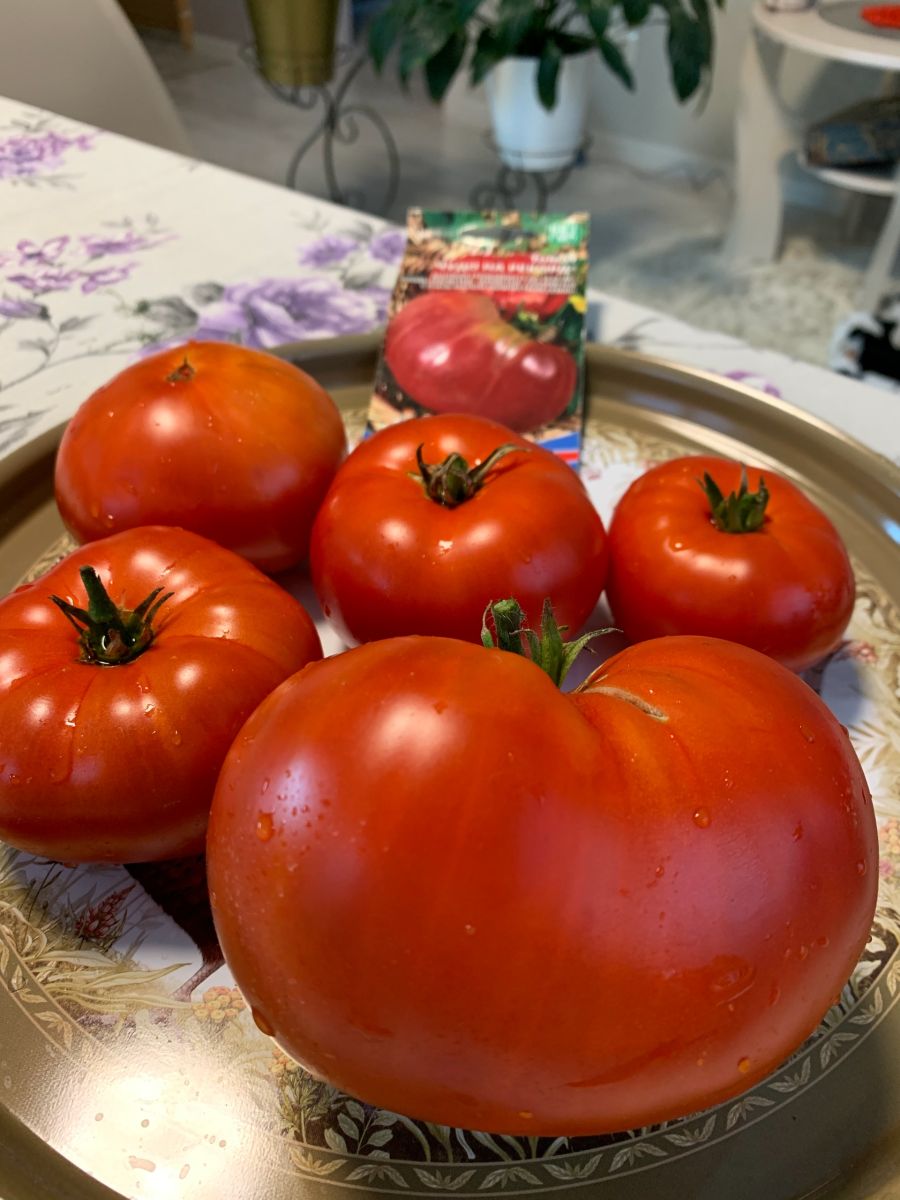 Сорт среднеспелый, светолюбивый, хорошо плодоносит в открытом грунте, не любит теплиц. Растение среднерослое, высотой до 1,5 м. Плоды гладкие, округло-плоские, красно-малинового цвета, плотные, с сахаристой мякотью и малым количеством семян, устойчивые к растрескиванию. Первый урожай из плодов массой 0,5-1 кг собирают до 1 августа. Второй урожай из 20-30 томатов среднего размера-до конца сентября. Урожайность до 10 кг/м2.