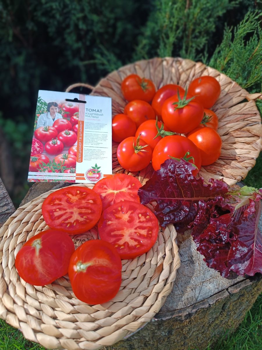 Сорт неприхотливый и нетребовательный, пасынкование ему необходимо, но незначительное, от основных болезней защищён генетически. Использование томата совершенно универсальное. О листьях хочется сказать отдельно. Они действительно похожи на кудри, так как сильно рассечены и напоминают морковную ботву, поэтому томат вполне может справиться с декоративной функцией на садовом участке. И это ещё не все «фокусы», на которые «способен» МАЛЫШ. Милашка-очаровашка, имеющий небольшой рост, такие плоды вам подарит, что ахнете!.. Да не каждый высокорослый томат подобные может дать: от 100 до 150 г, плоскоокруглые, многокамерные, слаборебристый… А какой урожай!.. 6,5–7 кг с м²! Вот так малыш, вот так удивил! Мал золотник, да дорог!