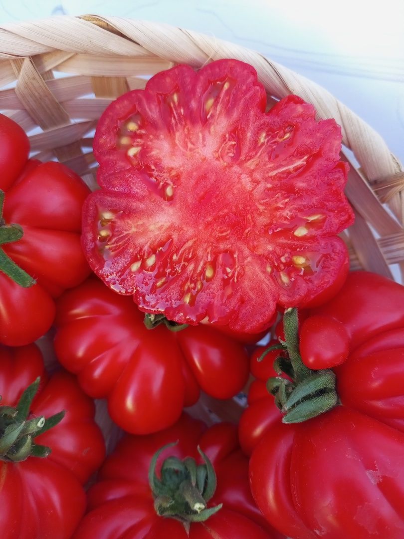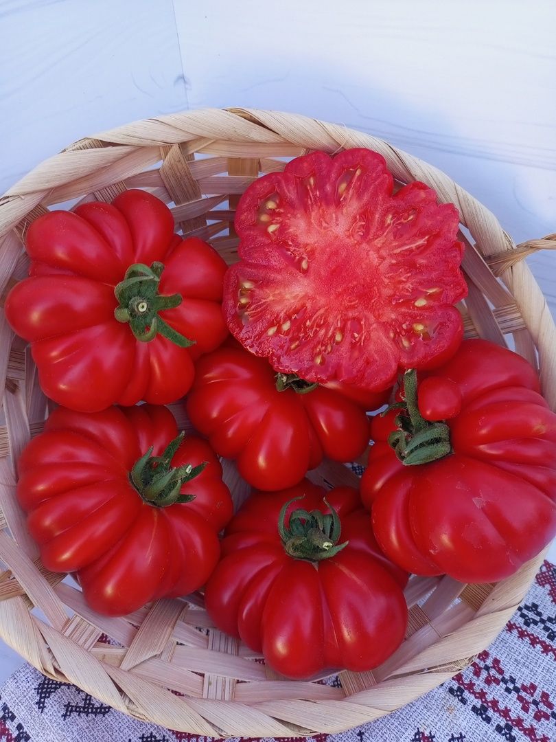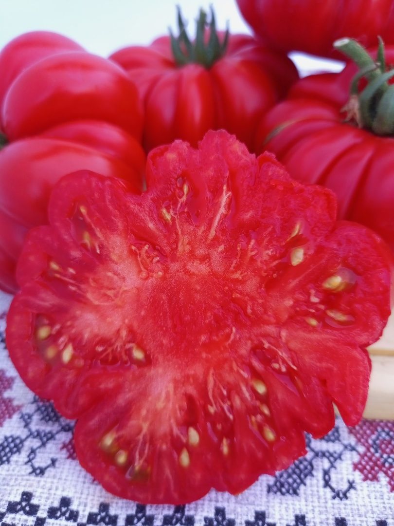Оригинальный, раннеспелый, крупноплодный сорт для открытого и закрытого грунта, удивляющий необычной экстравагантной формой плодов. Плоды ярко-красные, крупные, мясистые, массой до 300 г, очень вкусные. Плоды очень интересные, плоские, с ярко выраженной ребристостью, создающей впечатление, будто томат состоит из отдельных долек.